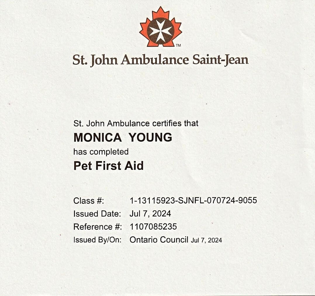 I have a Pet First Aid Certification from St.John Ambulance. I will let you know even if your dog even has hiccups and send you many pictures of your pet throughout the day.