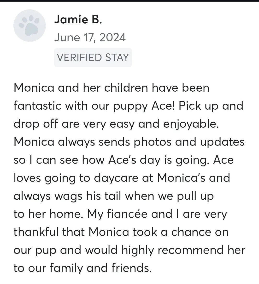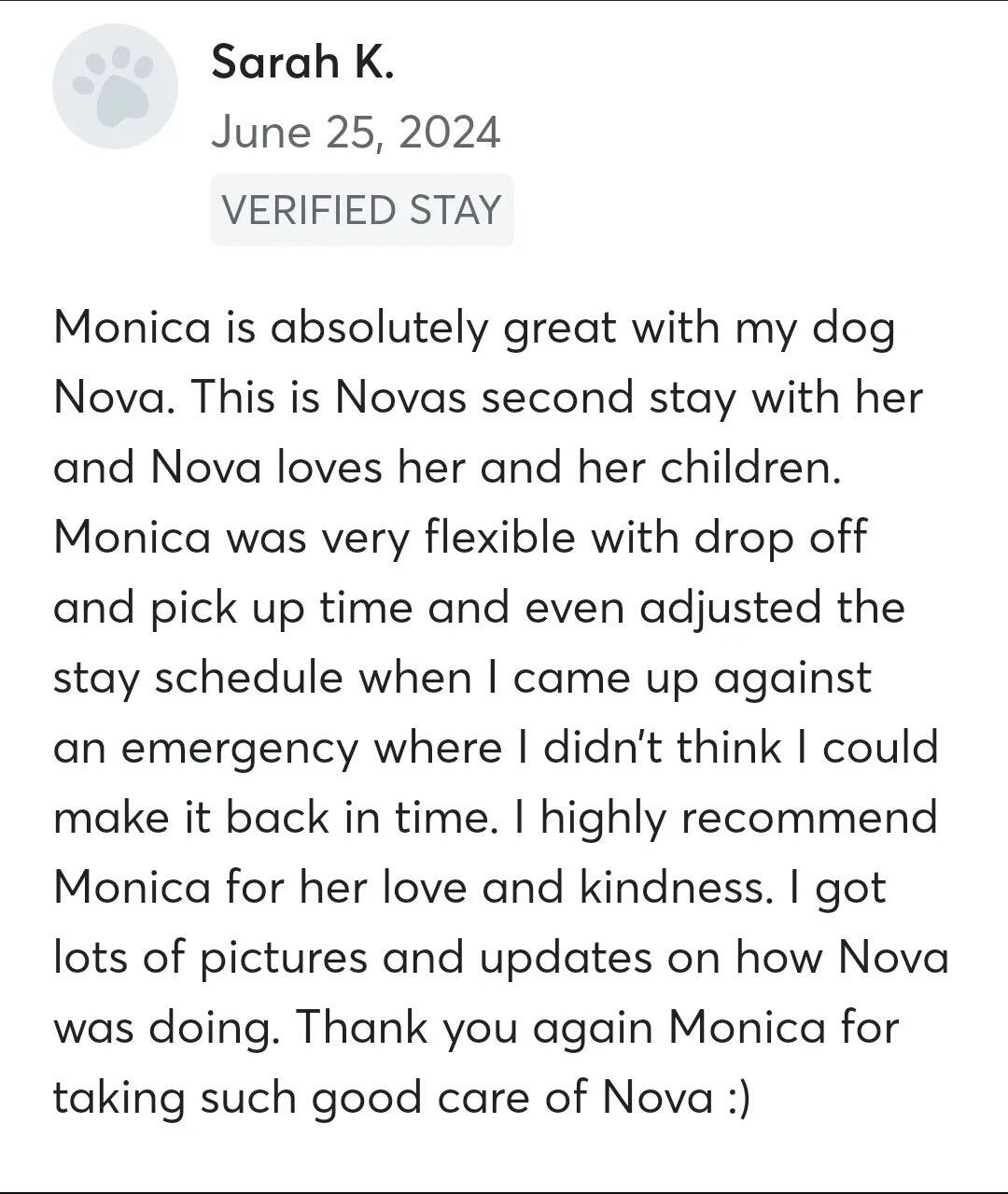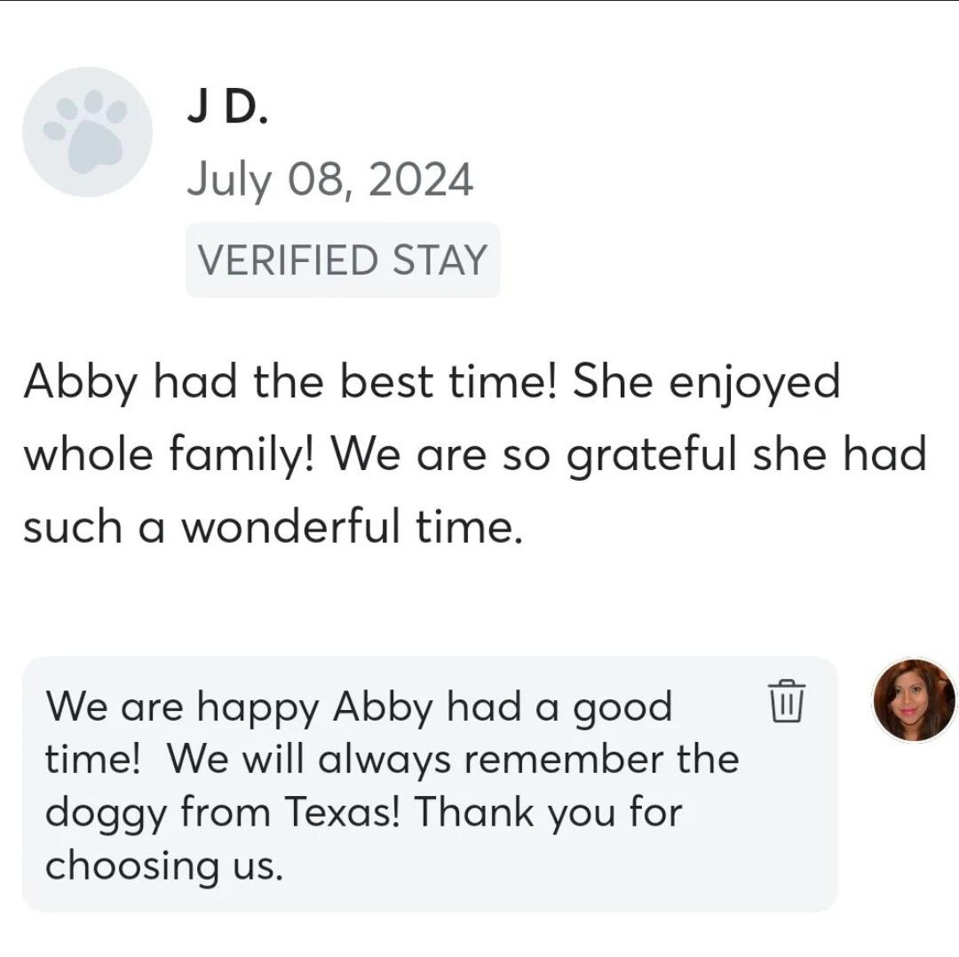 My services involve one-on-one care, which gives your pet my full loving attention. I won't host multiple families. I will only keep a maximum of 1 dog or 2 cats per family. Your dogs and cats can be safer and get more attention this way from myself and my children. This one-on-one experience allows your pet to have the most fun, feel the happiest, and be the safest.