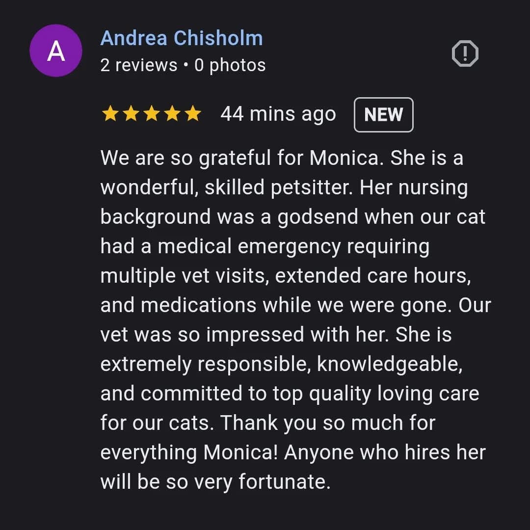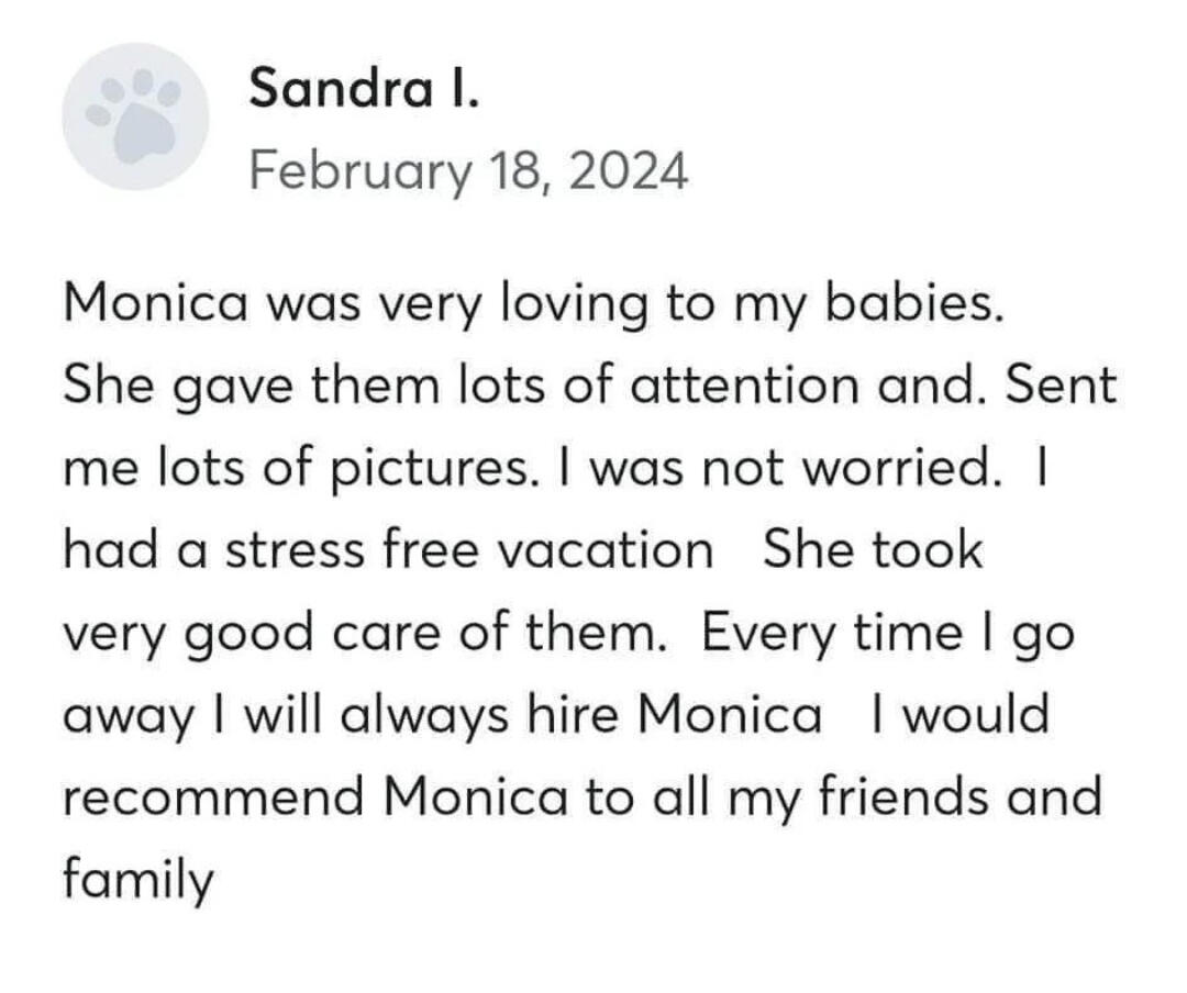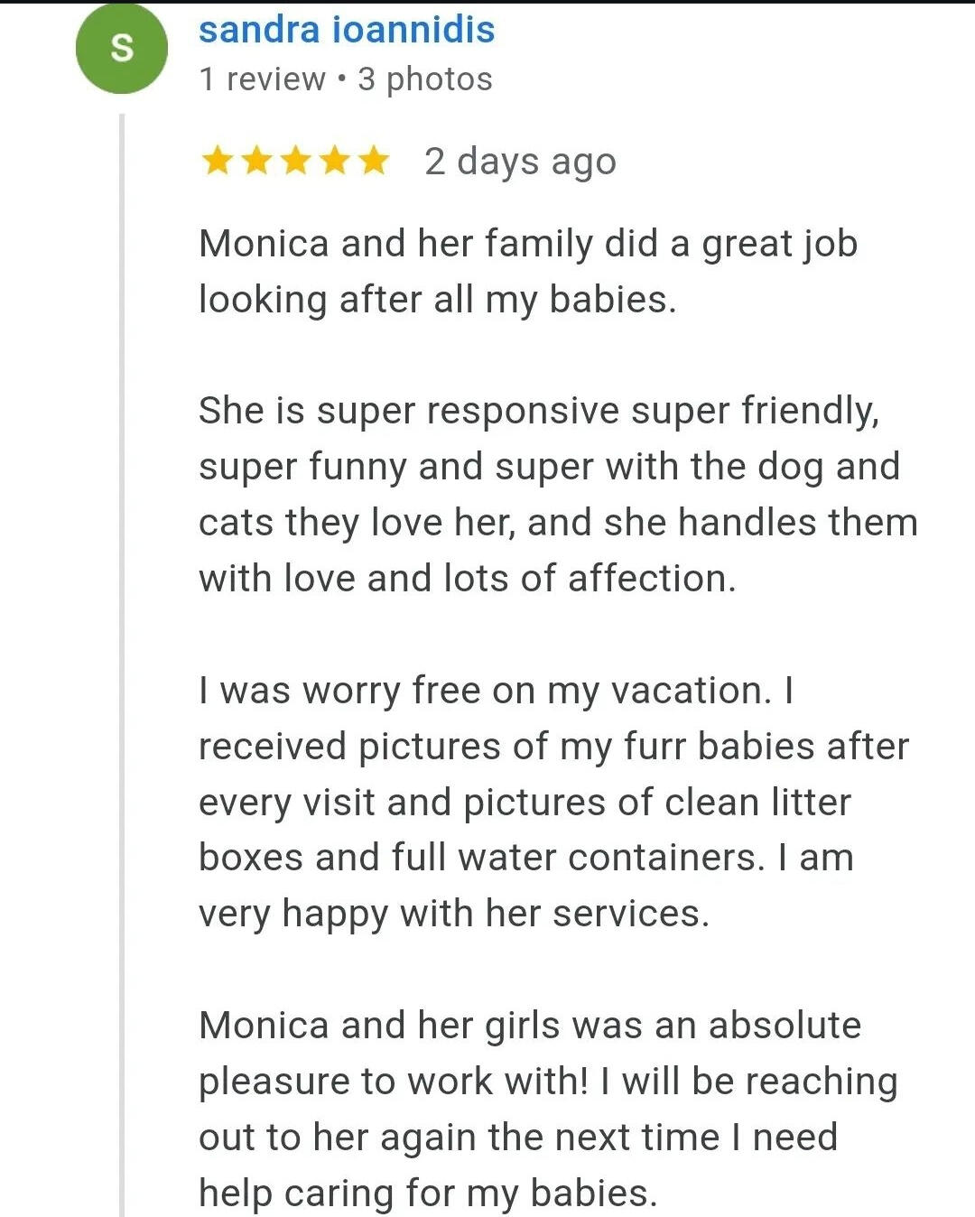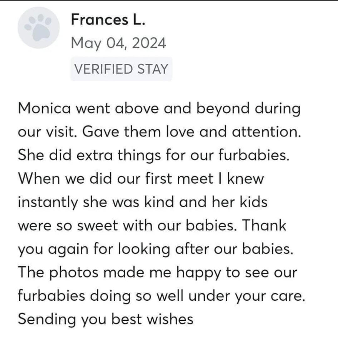 Follow me on Instagram where you will see many fur and feathered babies I have cared for and reviews from their families.