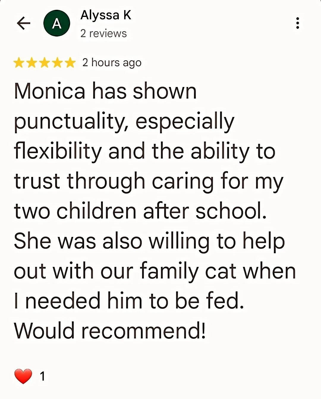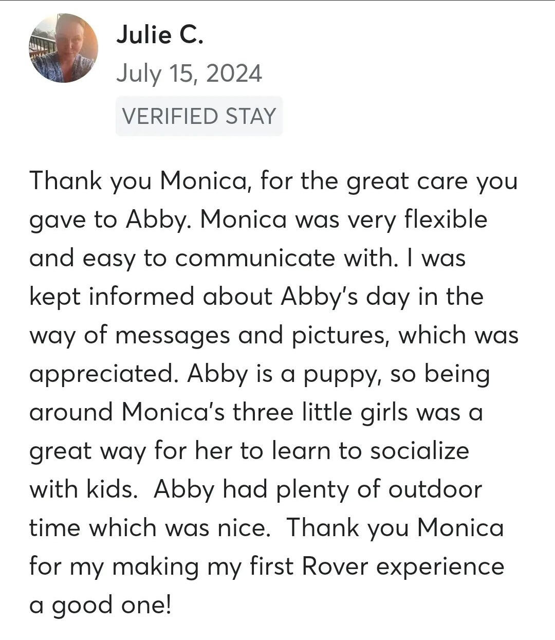 Hi, My name is Monica. I am currently a homeschooling mom and I love animals. I used to do nursing, but have since left the field and I am now studying as a distance student at Queen's University. I consider myself very responsible, affordable, and friendly. I have a lot of experience with animals. My mother is a dog trainer. My sister is a veterinary technician. My other sister works at a pet store. In my life, I have cared for rabbits, hamsters, guinea pigs, gerbils, fish, budgies, cockatiels, an Amazon parrot, canaries, conures, cats, and dogs.